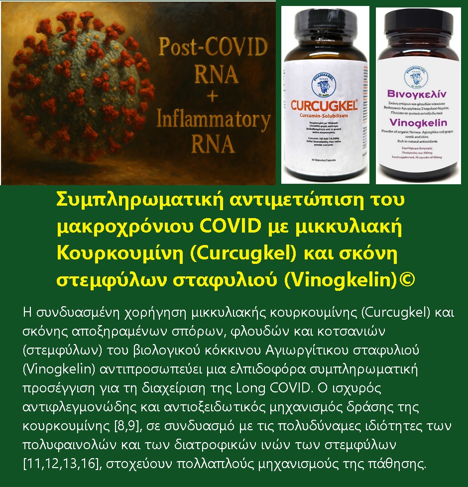 Η συνδυασμένη χορήγηση μικκυλιακής κουρκουμίνης (Curcugkel) και σκόνης αποξηραμένων σπόρων, φλουδών και κοτσανιών (στεμφύλων) του βιολογικού κόκκινου Αγιωργίτικου σταφυλιού (Vinogkelin) αντιπροσωπεύει μια ελπιδοφόρα συμπληρωματική προσέγγιση για τη διαχείριση της Long COVID.