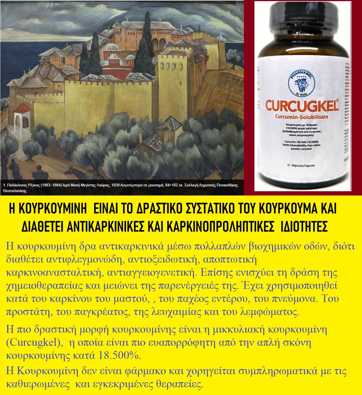 Δρ Δημήτριος Ν. Γκέλης, Αικατερίνη Γκέλη, Ευάγγελος Γκόλας, Άρης Πάγκαλος, Αss. Prof. Χρύσα Καραπάντζου, Δρ Κωνσταντίνος Αποστολόπουλος, Δρ Γεώργιος Κότσης Η κουρκουμίνη είναι το εκχύλισμα της σκόνης του αποξηραμένου ριζώματος κουρκουμάς, που διαθέτει ισχυρές αντιφλεγμονώδεις αντι-αγγειογενετικές, αντιοξειδωτικές, αντικαρκινικές, καρκινοπροφυλακτικές και αντιμεταστατικές ιδιότητες.